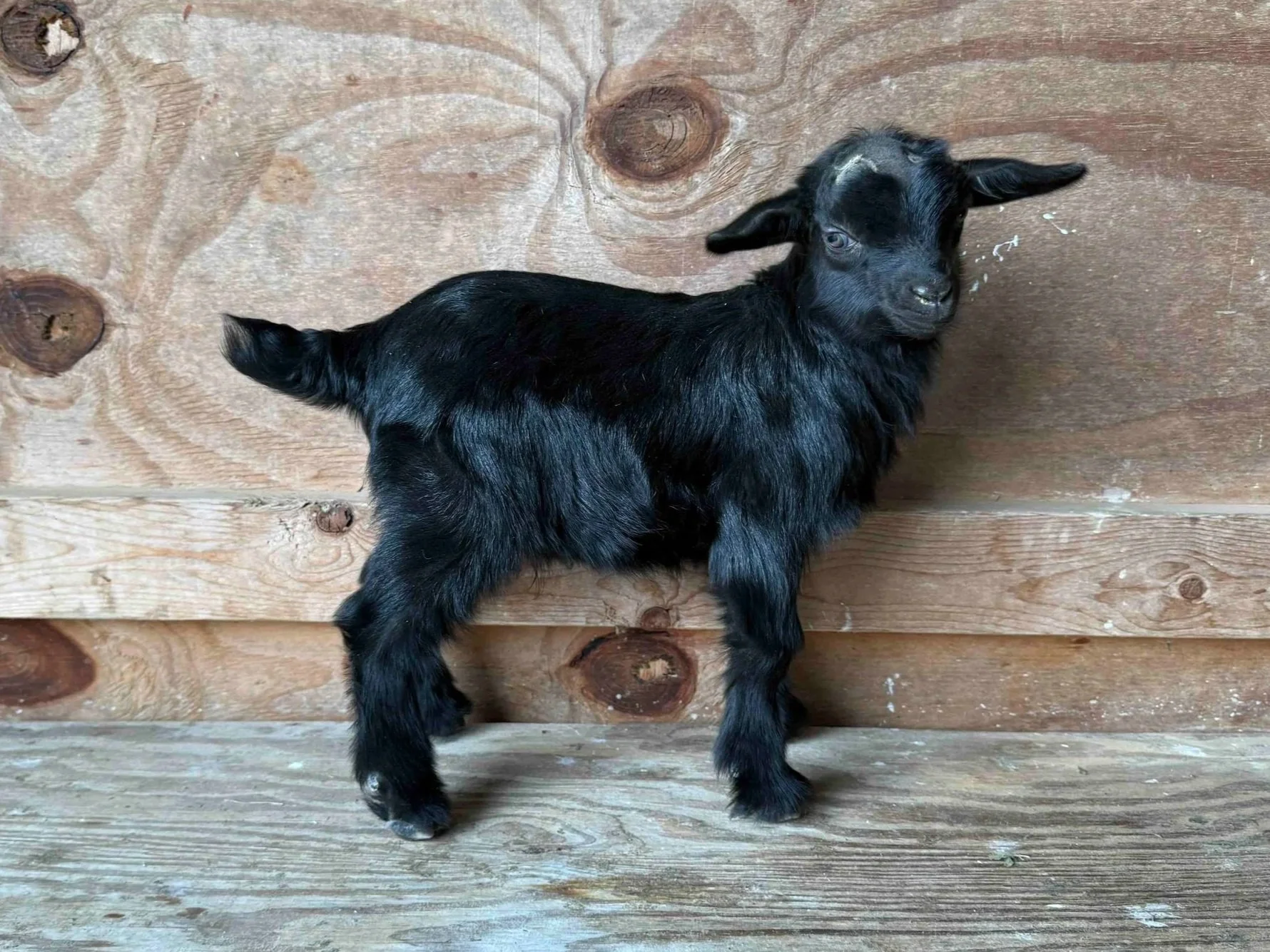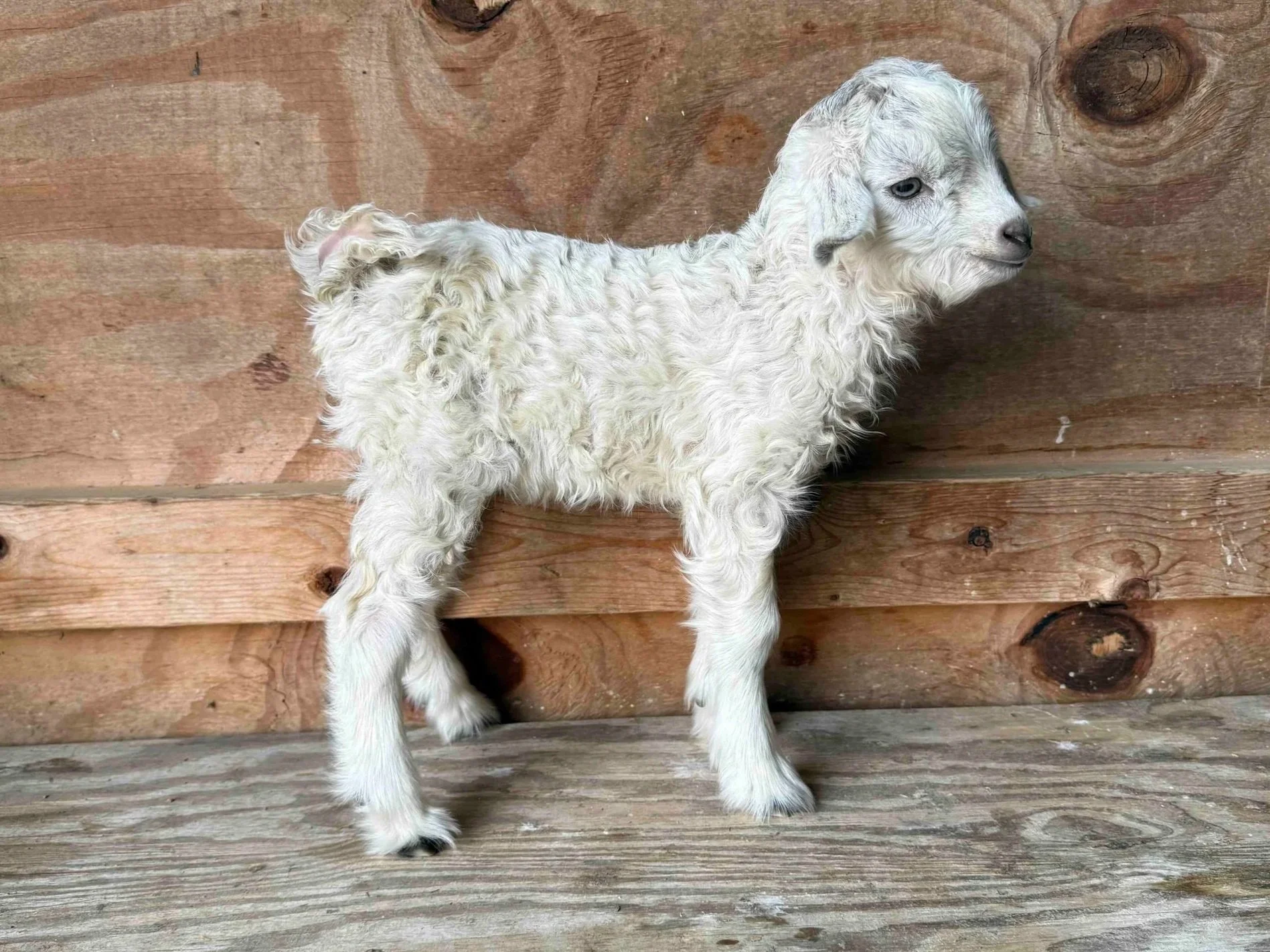 Star buckling out of Permanent Grand Champion Fleece goat Mountain Meadow Farm Tiny Dancer and Caney Fork Pygoras Sirius Lee Black. Incredible width, depth of chest and muscle on this little buckling. Despite his pin straight kid coat lineage suggests Type B fleece. Laid back personality.