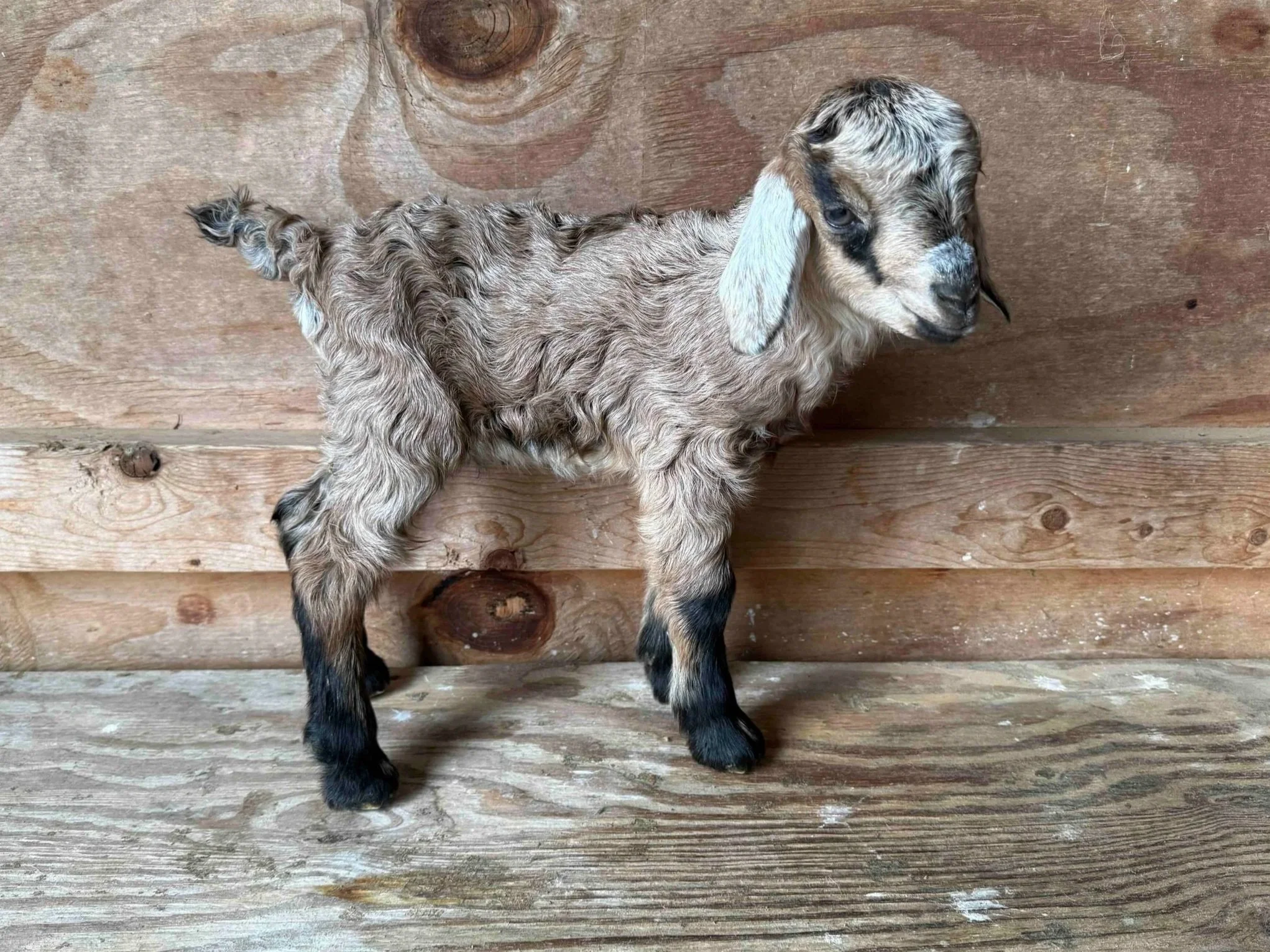 Out of Caney Fork Pygoras Sirius Lee Black and Little Hawk Farm Praline, who won Grand Champion Fleece at the 2025 Southeastern Animal Fiber Fair. Lovely brown caramel markings. Potential for Type B, cashmere-fine fleece. Wonderful personality like his brother.